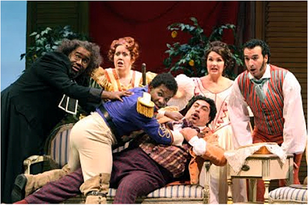 Photo: Eric Owens, Cynthia Hanna, Lawrence Brownlee, Donato DiStefano, Silvia Tro Santafe, Simone Alberghini (photo: Karin Cooper)