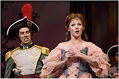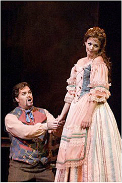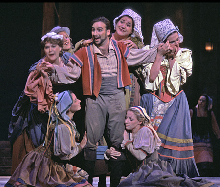 The Elixir of Love has not been seen on the Vancouver Opera stage for 30 years but David Gately's delightful production was worth the wait. Gately's kinetic directorial style kept the show moving without overdoing the slapstick, throwaway jokes and sight gags. He used points of repose only for moments of sentiment and reflection, and crowd scenes to enhance atmosphere, either by involving the crowds in the action itself, or by holding them in a static tableau, throwing the actions of the principals into strong relief.